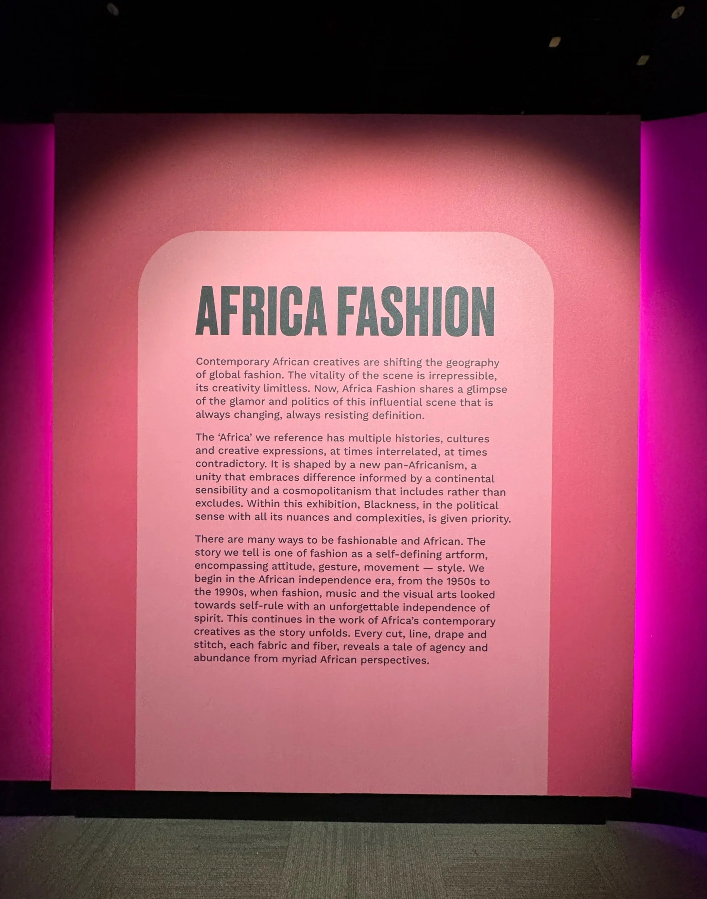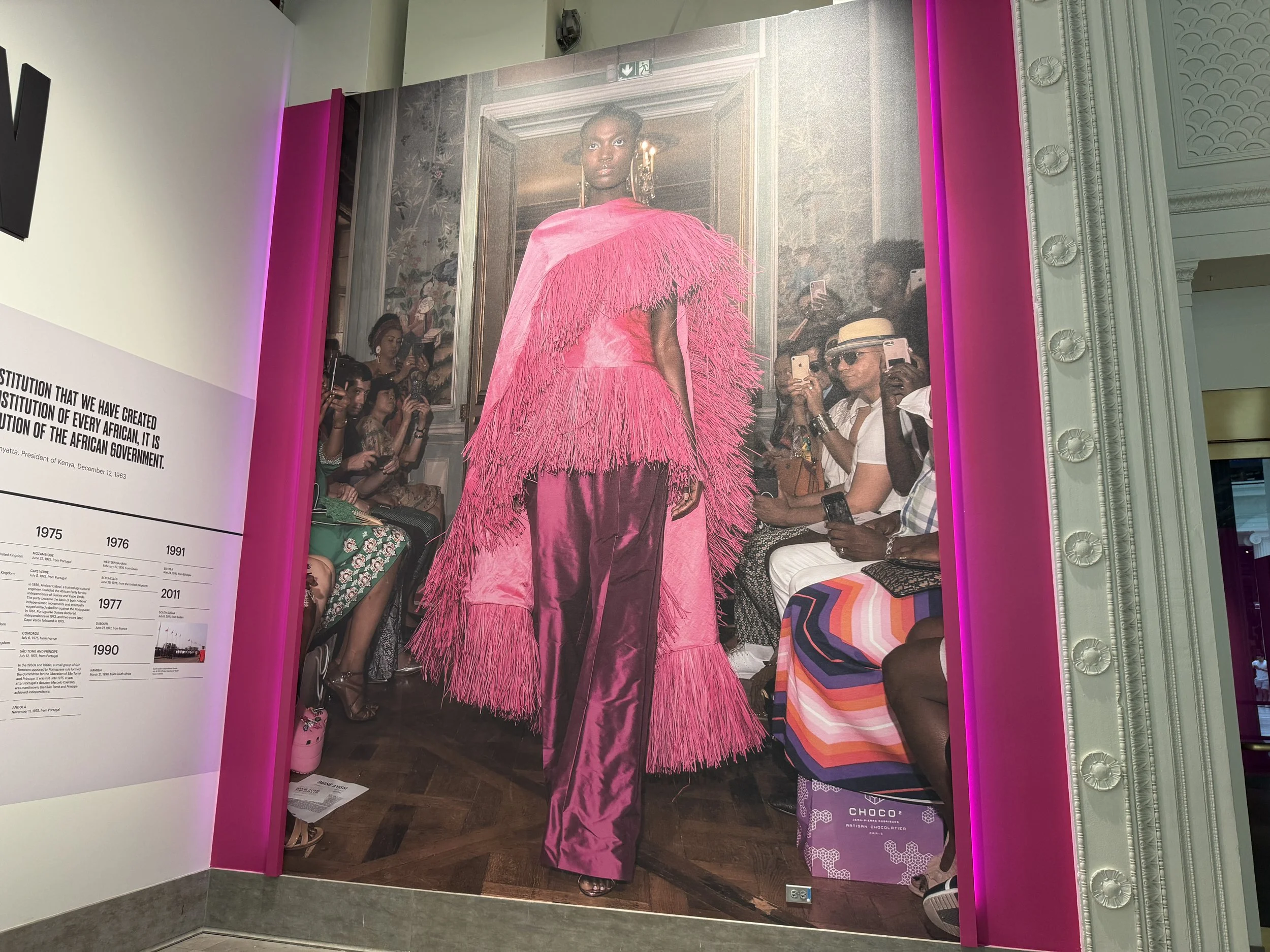 The exhibit began with a display of the dates when 54 African countries gained their independence. In my opinion, this was the perfect way to start the exhibit. Gaining independence had such a profound effect on everything in these countries, fashion included. Fashion has always been a tool in rebellions, protests, politics, renaissance movements etc. This exhibit touched on those things as well as it being a declaration of creativity, freedom, self-expression, and talent!